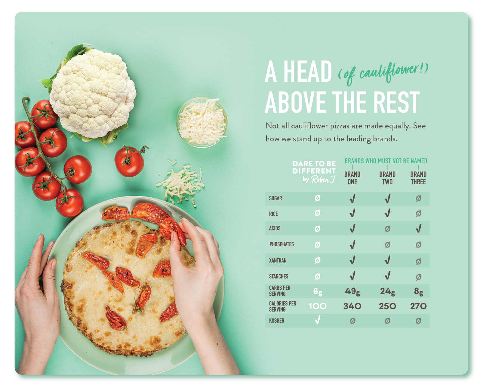 Robin Jemal began creating gourmet kosher meals and treats for family and friends in 2012. Over time, the popularity of her recipes grew and grew, and she decided to launch a catering business. It was so successful, she published a cookbook and started making low-carb and keto-friendly, plant-based crusts, crisps and gnocchis. The new line took off and it wasn’t long before her delicious low-carb pizzas were being carried in local grocers. They wanted to make it to larger markets so they came to us looking for a brand refresh that would get stores to notice them!